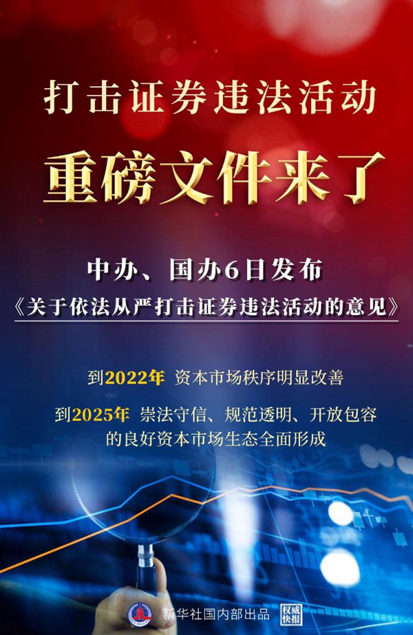 新華社北京7月6日電(記者張千千 劉慧)中共中央辦公廳、國務(wù)院辦公廳6日公開發(fā)布了《關(guān)于依法從嚴(yán)打擊證券違法活動的意見》,對建立健全資本市場執(zhí)法司法體制機制、依法從嚴(yán)打擊證券違法活動、推動資本市場高質(zhì)量發(fā)展作出重要部署。