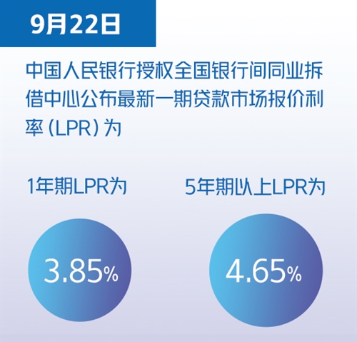 9月22日,中國(guó)人民銀行授權(quán)全國(guó)銀行間同業(yè)拆借中心公布最新一期貸款市場(chǎng)報(bào)價(jià)利率(LPR)為:1年期LPR為3.85%,5年期以上LPR為4.65%。兩項(xiàng)貸款市場(chǎng)報(bào)價(jià)利率均連續(xù)18個(gè)月保持這一水平。