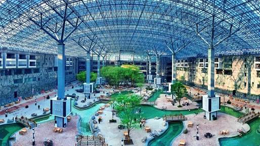 五大連池火山溫泉水世界是黑龍江省北部最大的室內(nèi)水上娛樂項(xiàng)目,總占地面積15.2萬㎡?;鹕綔厝澜缡且詼厝B(yǎng)生文化為主題,以火山為主要元素的園林式水上樂園。對(duì)游樂設(shè)施進(jìn)行文化植入、主題化包裝,建成集特色溫泉水上游樂、餐飲娛樂、休閑購物和旅游觀光于一體的室內(nèi)水上娛樂及溫泉養(yǎng)生綜合體。