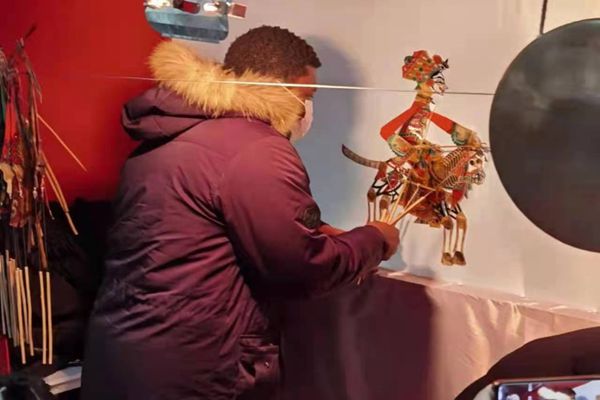 在望奎民間藝人表演的皮影戲現(xiàn)場(chǎng),留學(xué)生們紛紛舉起手機(jī)拍照留念,并發(fā)出了陣陣贊嘆?!捌び笆怯皿H皮制作上色的,大家猜猜它是男生還是女生?”對(duì)外漢語(yǔ)系教師張明明帶領(lǐng)留學(xué)生來(lái)到皮影戲的后臺(tái),講解皮影的制作工藝和皮影劇的來(lái)歷。留學(xué)生們被皮影戲深深吸引,聽(tīng)得津津有味,并親自操作體驗(yàn)了一下。