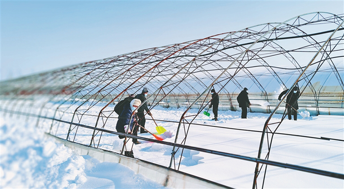 在綏化市慶安縣久勝鎮(zhèn)久宏園區(qū)——國家現(xiàn)代農業(yè)科技示范展示基地,40多名村民正在清雪扣棚。預計在15天內園區(qū)內的80棟自動化水稻育苗大棚將全部完成清雪扣棚作業(yè)。