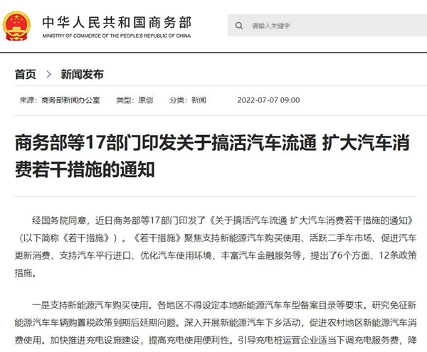 日前,商務部等17部門印發(fā)了《關(guān)于搞活汽車流通 擴大汽車消費若干措施的通知》,《措施》聚焦支持新能源汽車購買使用、活躍二手車市場、促進汽車更新消費、支持汽車平行進口、優(yōu)化汽車使用環(huán)境、豐富汽車金融服務等,提出了6個方面、12條政策措施。