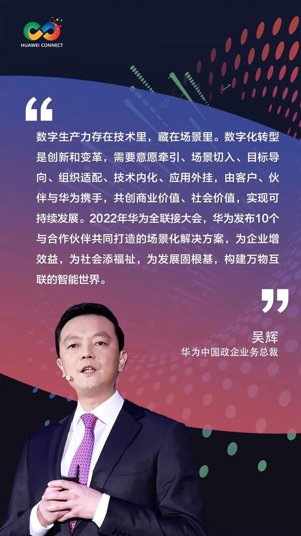 當前,我國的數(shù)字化已經(jīng)進入快車道,釋放數(shù)字生產(chǎn)力正當其時。而“數(shù)字生產(chǎn)力就存在技術里,藏在場景里?!被诖耍A為中國政企業(yè)務總裁吳輝在會上發(fā)表了題為《為行業(yè)找技術,深入場景創(chuàng)造價值》的主題演講,重點分享了華為基于多年的探索和實踐總結(jié)出的行業(yè)數(shù)字化轉(zhuǎn)型的方法論和企業(yè)轉(zhuǎn)型成功秘訣。