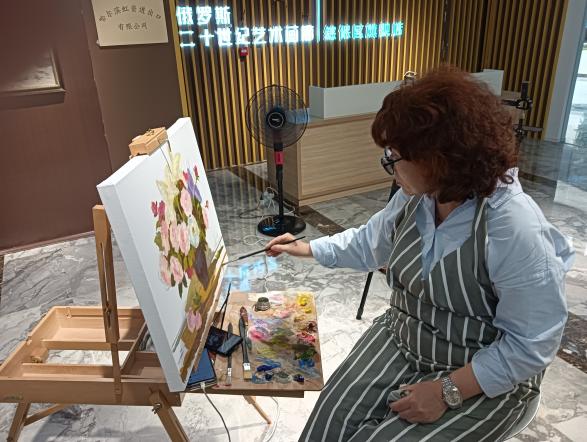 活動(dòng)期間,柯切爾金娜·伊麗娜到哈爾濱綜合保稅區(qū)參觀俄羅斯文化展示館(俄中藝術(shù)線(xiàn)下商城體驗(yàn)店No.1),與哈爾濱綜合保稅區(qū)領(lǐng)導(dǎo)就中俄優(yōu)秀傳統(tǒng)文化進(jìn)行了友好交流,并即興在展館內(nèi)現(xiàn)場(chǎng)作畫(huà)。伊麗娜以繪畫(huà)花卉靜物著名,曾榮獲俄羅斯文化部獎(jiǎng)狀、俄羅斯文化部榮譽(yù)證書(shū)、俄羅斯美協(xié)銀質(zhì)獎(jiǎng)?wù)隆?