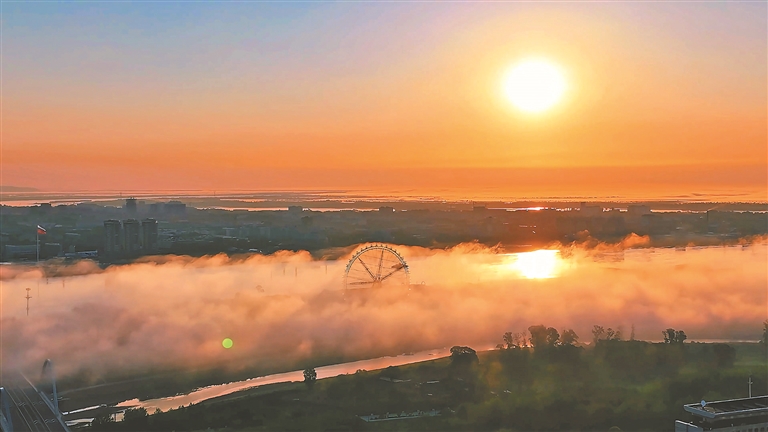 本報4日訊(關(guān)桐 楊啟坤 記者 潘宏宇)4日清晨,在黑河市愛輝區(qū),中俄界江黑龍江上橙光氤氳,霧氣繚繞,如夢似幻,宛若仙境。
