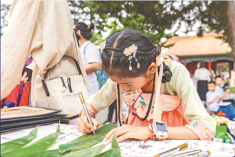 本報10日訊(記者 董云平)對古詩摘“高粽”香囊、體驗(yàn)古風(fēng)花鈿、沐蘭湯凈手、粽葉寫祝福、解鎖端午限量印章、領(lǐng)取端午彩絲……10日,省民族博物館融合傳統(tǒng)習(xí)俗與現(xiàn)代創(chuàng)意,開啟沉浸式“端午文廟行:粽情畫意 古韻新體驗(yàn)”,多彩傳統(tǒng)民俗、非遺文化將活動現(xiàn)場節(jié)日氛圍感拉滿,帶給大家端午出游“新”體驗(yàn)。
