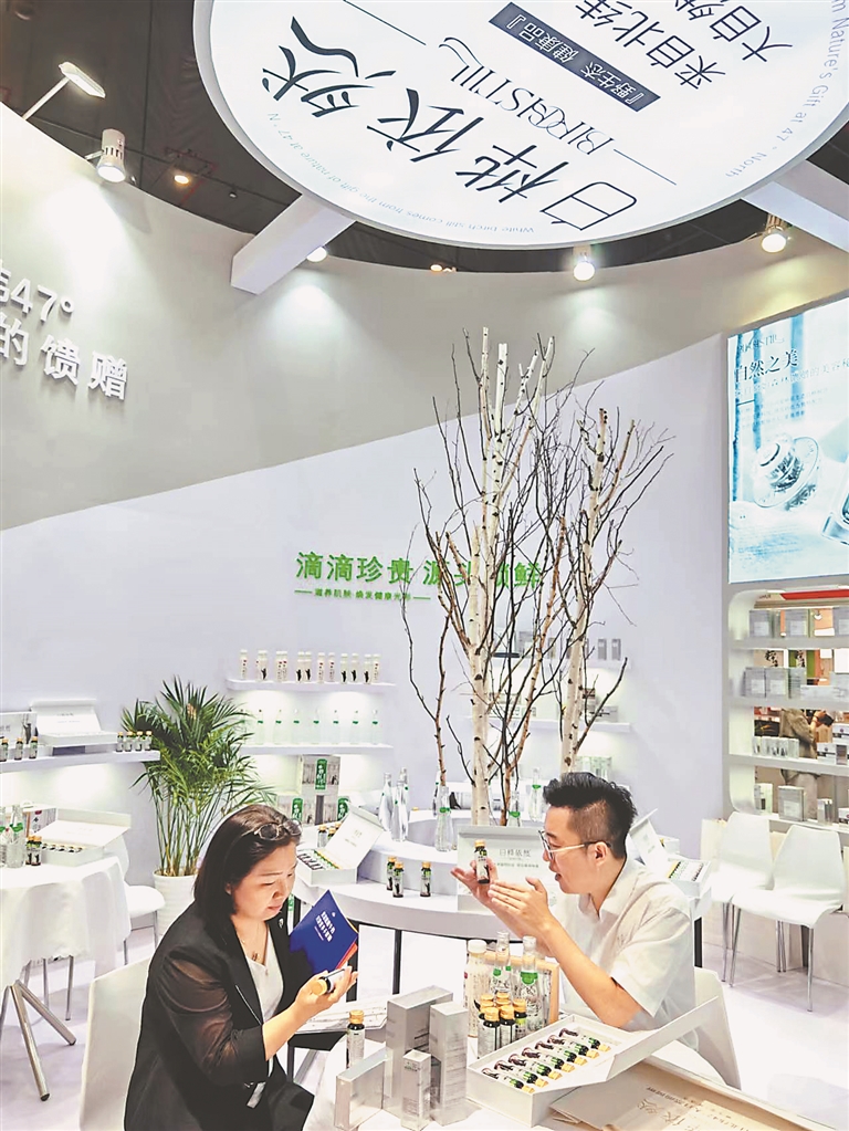 “產(chǎn)品所用的白樺汁原料源自鐵力市,這里處在北緯47°小興安嶺的黑土地上?!焙邶埥陼钥萍加邢薰究偨?jīng)理馬光西介紹,公司充分利用龍江“九珍十八品”資源,由雨曉集團與清華大學深圳科研團隊合作,運用先進技術(shù)開發(fā)提煉出白樺汁精華,為消費者不斷提供囗感獨特的綠色飲品、化妝品?,F(xiàn)在企業(yè)庫存清空,鐵力工廠正加班加點生產(chǎn)。本次展會的火爆出圈,讓企業(yè)對白樺汁系列產(chǎn)品走向世界市場更加充滿信心。