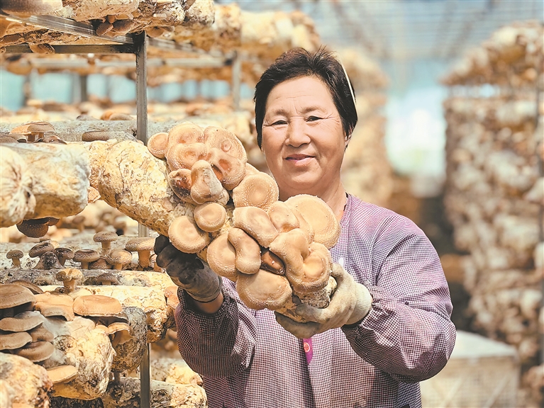 陽(yáng)光透過(guò)棚室,溫?zé)岬目諝庵袕浡ü教赜械南銡?。一根根整齊擺放的菌棒上,淡褐色的花菇簇?fù)矶?,“傘面”花紋爆開,煥發(fā)著勃勃生機(jī)。“一棟高標(biāo)準(zhǔn)大棚放置一萬(wàn)根菌棒,每年生長(zhǎng)季可以采收六至七茬,一棟大棚至少收獲2萬(wàn)斤花菇,按市場(chǎng)價(jià)7元一斤算,產(chǎn)值就是14萬(wàn)元?!必?fù)責(zé)花菇生產(chǎn)技術(shù)管理的趙景龍說(shuō)起花菇種植的“錢景”,一臉笑意。