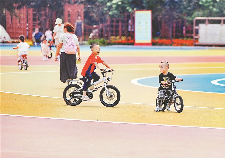 公園內(nèi)4000多平方米的休閑廣場(chǎng),經(jīng)過改造、彩化,呈現(xiàn)出全新的面貌,孩子們?cè)谏厦骝T車、奔跑。彩色廣場(chǎng)將工業(yè)主題元素融入設(shè)計(jì)理念,與周圍的景觀小品相得益彰。