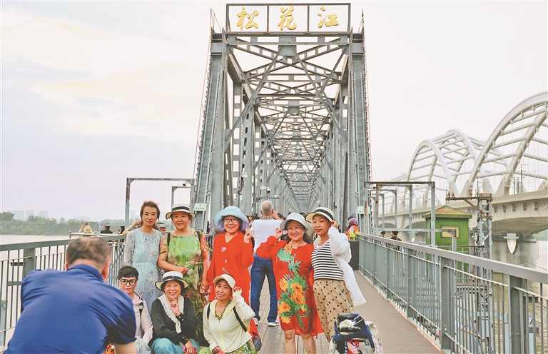 雖然入伏了,但哈爾濱市百年老橋?yàn)I洲鐵路橋上江風(fēng)習(xí)習(xí)、清爽宜人。無(wú)論白天還是晚上,都有市民和來(lái)自天南海北的游客來(lái)此打卡拍照、觀賞美景、沐浴清涼。