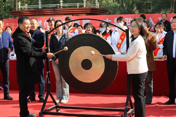 隨后黑龍江省希望工程捐助中心杜晶主任和哈師大附中校長劉振成一同鳴響大鑼,鑼聲響徹整個凱德廣場,劉校長宣布義賣會正式開始。