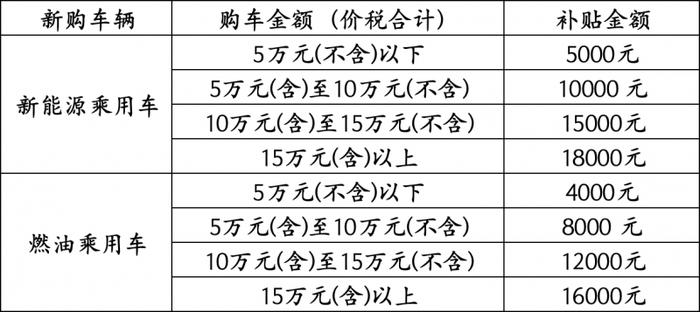 按《通知》要求,新補貼標準分為四檔。新購車輛為新能源乘用車的,發(fā)票金額在5萬元(不含)以下,每輛車補貼5000元;5萬元(含)至10萬元(不含),每輛車補貼10000元;10萬元(含)至15萬元(不含),每輛車補貼15000元;15萬元(含)以上,每輛車補貼18000元。新購車輛為燃油乘用車的,5萬元(不含)以下,每輛車補貼4000元;5萬元(含)至10萬元(不含),每輛車補貼8000元;10萬元(含)至15萬元(不含),每輛車補貼12000元;15萬元(含)以上,每輛車補貼16000元。