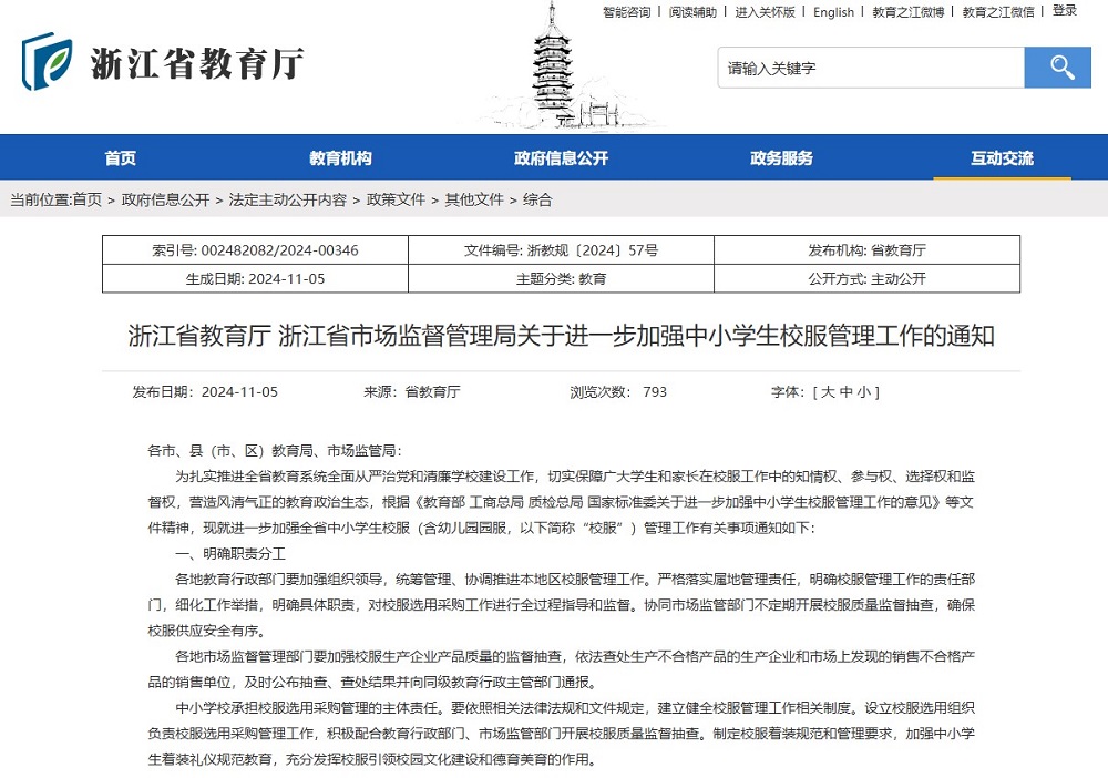 作為服裝產(chǎn)業(yè)發(fā)達(dá)省份,浙江省一直注重校服質(zhì)量。如2014年浙江省教育廳聯(lián)合浙江省質(zhì)量技術(shù)監(jiān)督局發(fā)布《關(guān)于進(jìn)一步加強(qiáng)學(xué)生服裝和床上用品管理工作的通知》;2018年,浙江省質(zhì)監(jiān)局聯(lián)合教育廳、工商局聯(lián)合發(fā)布了《浙江省學(xué)生服質(zhì)量提升行動工作方案》;2022年10月,浙江省《教育收費(fèi)政策(2022年)》規(guī)定學(xué)校收取服務(wù)性收費(fèi)和代收費(fèi),堅持學(xué)生自愿和非營利原則,不得與學(xué)費(fèi)、住宿費(fèi)合并統(tǒng)一收取,不得從中牟利。