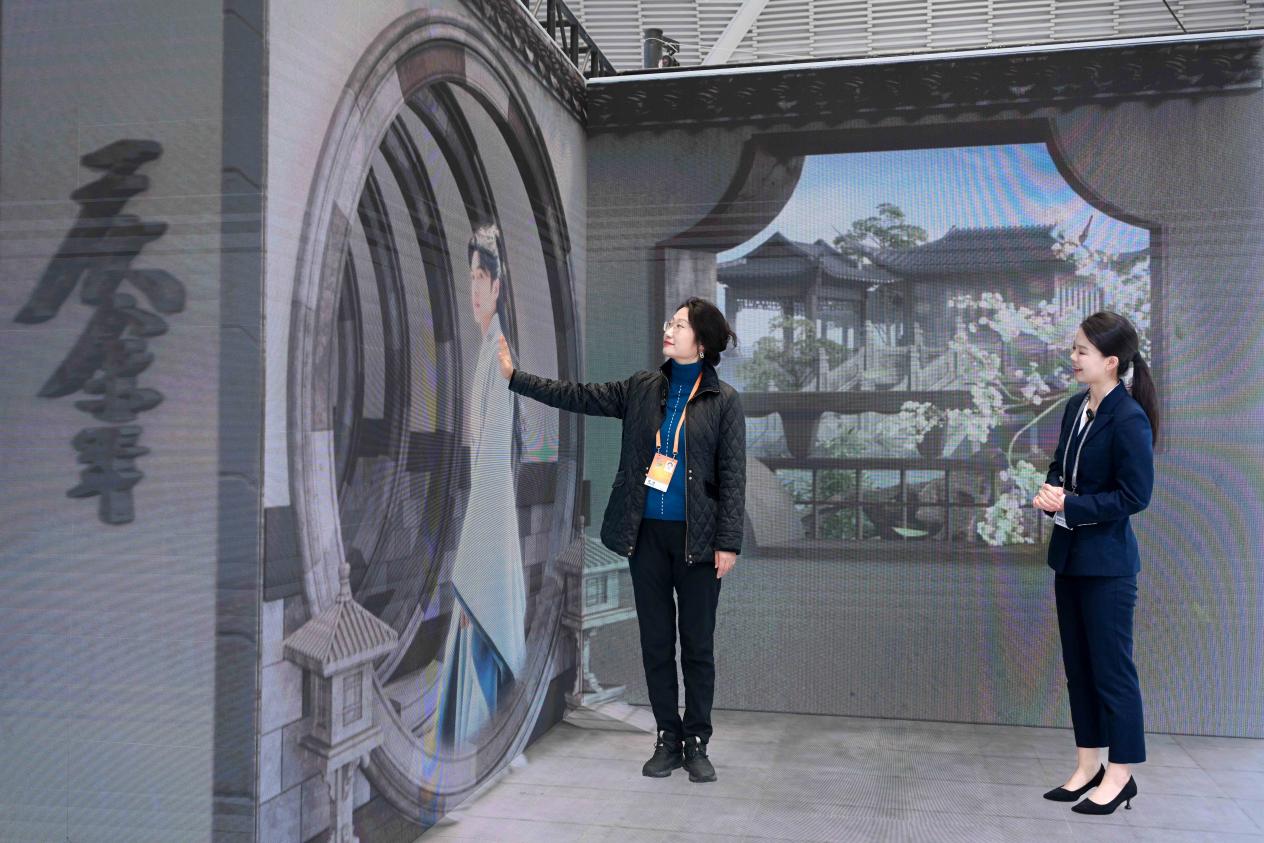 文化板塊,是騰訊本次展會(huì)的一大亮點(diǎn)。在“騰訊文化IP盒子”中,集合騰訊文學(xué)、影視、音樂、游戲、電競、動(dòng)漫六大板塊的文化產(chǎn)業(yè)集群躍然眼前。在以裸眼3D模式呈現(xiàn)的三面屏中,觀眾可以一覽騰訊文化產(chǎn)業(yè)的全球布局,走入《慶余年》《繁花》等IP經(jīng)典場景中進(jìn)行合影,并通過現(xiàn)場設(shè)置的AI智能體,與劇中的虛擬角色實(shí)時(shí)語音互動(dòng)。