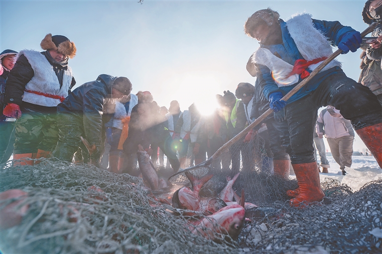 最具儀式感的冬捕祭祀儀式無(wú)疑是本次活動(dòng)的重頭戲之一。在魚把頭的帶領(lǐng)下,漁民們遵循古老傳統(tǒng),祈求庇佑、漁業(yè)豐收,隨著漁民收網(wǎng),網(wǎng)中的大魚逐漸顯露出湖面。