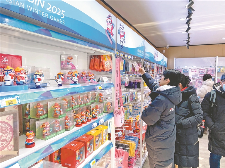 本報訊(記者郭俊峰)亞冬會即將開幕,位于哈爾濱國際會展體育中心亞冬會主媒體中心一層的特許商品零售店內(nèi)人聲鼎沸,亞冬會吉祥物玩偶、冰雪運動徽章、琉璃冰壺等300余款特許商品引發(fā)搶購熱潮?;鹁嫦盗邢蘖堪婕o念品、亞冬會徽章、“濱濱”“妮妮”火炬?zhèn)鬟f紀念冰箱貼等極具收藏價值的限量版特許商品更是熱銷貨。