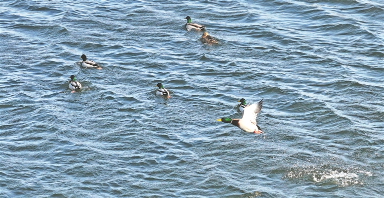 小野鴨融入湖中的一大群綠頭鴨,野鴨湖即將迎來春暖花開的季節(jié)。本報(bào)記者 張澍攝