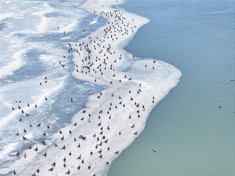 近日,松花江哈爾濱段出現(xiàn)大群的鸕鶿,它們在冰融的松花江上聚在一起,觀察著江面魚類的蹤跡,一旦發(fā)現(xiàn)魚群,近千只鸕鶿就快速游過去,潛水捕起“開江魚”。