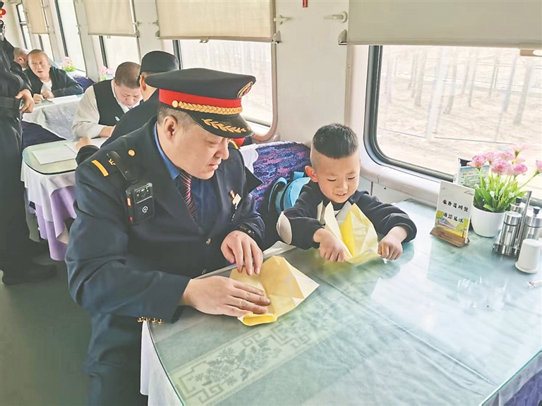本報(bào)訊(張蔚萌 王夢(mèng) 記者 王迪)近日,由鄭州開(kāi)往海拉爾的K927次列車(chē)從昌圖站駛出后,列車(chē)長(zhǎng)孫志強(qiáng)接到12306轉(zhuǎn)發(fā)的緊急尋人求助工單。經(jīng)過(guò)與客服溝通了解后得知,旅客劉玲玲帶6歲兒子劉俊澤從沈陽(yáng)北站乘車(chē)至昌圖站,因下車(chē)時(shí)忙于整理行李,將座位上熟睡的孩子遺落在列車(chē)上。列車(chē)長(zhǎng)孫志強(qiáng)通過(guò)對(duì)講機(jī)立即組織各節(jié)車(chē)廂列車(chē)員尋找孩子,確定孩子位置后迅速趕到現(xiàn)場(chǎng)。為了緩解孩子的緊張情緒,他化身“臨時(shí)爸爸”,將孩子帶到了餐車(chē),不僅準(zhǔn)備了一些自帶的小零食,還陪孩子一起折紙飛機(jī)。當(dāng)列車(chē)??块L(zhǎng)春站后,孫志強(qiáng)按照其母親劉玲玲的要求,將孩子安全移交給長(zhǎng)春站工作人員,等待其家屬前來(lái)接領(lǐng)。