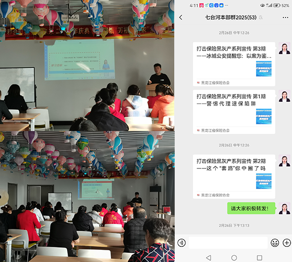 在此次打擊“代理退?!毙麄骰顒又?,七臺河中支利用微信工作群、微信朋友圈轉(zhuǎn)發(fā)宣傳內(nèi)容,詳細(xì)剖析了黑灰產(chǎn)的常見運作模式,非法“代理退?!笨赡芙o消費者帶來的四方面風(fēng)險:一是資金受損風(fēng)險;二是喪失正常保險保障的風(fēng)險;三是個人信息泄漏風(fēng)險;四是相關(guān)行為可能導(dǎo)致消費者面臨訴訟等法律風(fēng)險。號召廣大群眾增強(qiáng)風(fēng)險防范意識,警惕非法“代理退?!碧茁?。