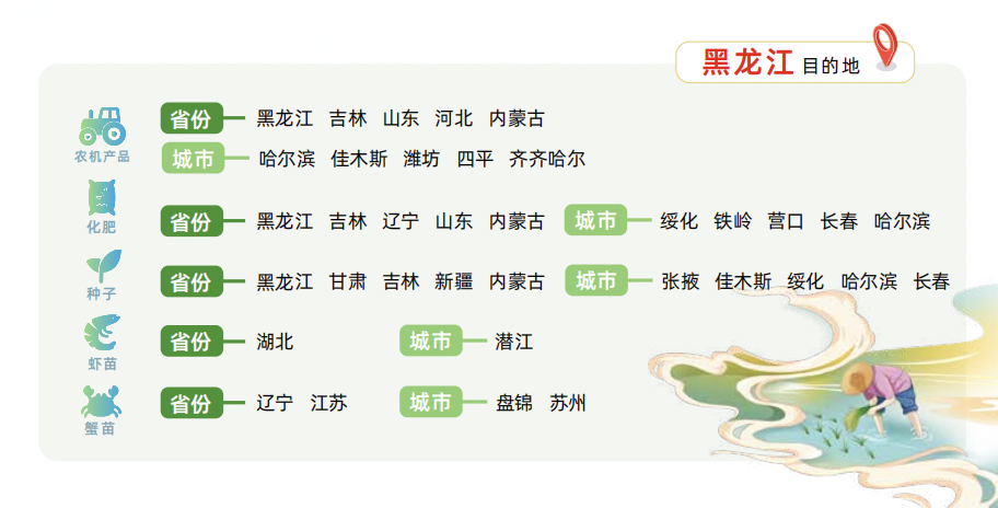化肥和種子是春耕不可或缺的“糧食”。運(yùn)滿滿大數(shù)據(jù)顯示,運(yùn)往黑龍江的化肥產(chǎn)品主要來自東北三省以及山東、內(nèi)蒙古等地,黑龍江綏化、哈爾濱等地區(qū)在省內(nèi)化肥調(diào)配中發(fā)揮了重要作用,省外的鐵嶺、營口、長春等地也積極輸送化肥。種子產(chǎn)品則來自黑龍江本地以及甘肅、吉林、新疆、內(nèi)蒙古等地,佳木斯、綏化、哈爾濱等地成為省內(nèi)種子供應(yīng)的樞紐,省外的張掖、長春等地也為黑龍江春耕貢獻(xiàn)力量。