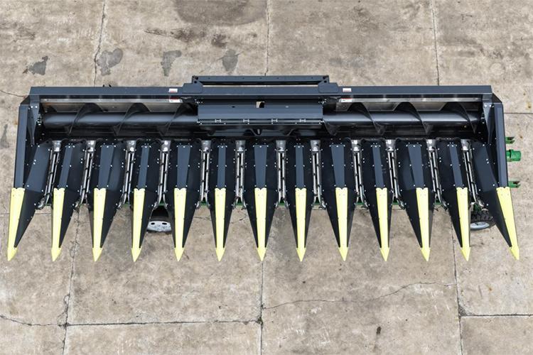 現(xiàn)場會上,最讓人駐足的是現(xiàn)場展示的意大利卓收割臺, 此次引入的卓收割臺,其自動摘穗板每行單元可實現(xiàn)自動開合且?guī)в袦p震功能,能根據(jù)玉米粗細靈活調(diào)節(jié)間隙,有效解決了其他品牌割臺無法對每行每株精準適配的問題;同時,收割臺的拉莖輥長度較其他品牌割臺增加 8 公分,讓割臺更貼合地面,在收獲倒伏玉米時作業(yè)角度更優(yōu),大幅減少 “跳棒” 現(xiàn)象。此外,卓收割臺的拉莖輥及刀片采用螺栓固定設(shè)計,可隨時調(diào)整位置或更換部件,避免了其他割臺因拉莖輥及刀片為一體式設(shè)計、損壞后需整體更換的弊端。