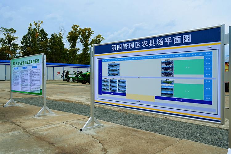 走進引龍河農(nóng)場第四管理區(qū)的農(nóng)機具停放場,首先映入眼簾的是《農(nóng)具場擺放平面圖》,不同顏色的線條清晰標注著拖拉機區(qū)、收獲機區(qū)、農(nóng)具存放區(qū)的位置。