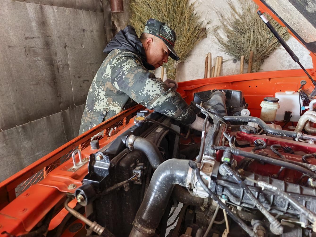 林場(chǎng)技術(shù)人員正在檢修維護(hù)防火車(chē)輛(柏松 攝)
